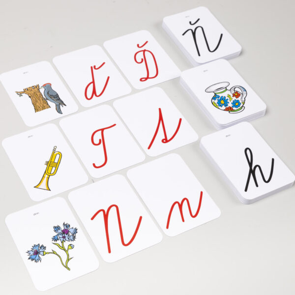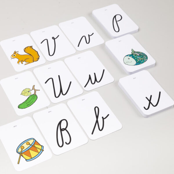 Praktická učebná pomôcka pri nácviku čítania a písania jednotlivých písmen abecedy. V ponuke veľké a malé písané písmená + nápovedné obrázky, obojstranne, farebne tlačené. Využitie na magnetickej tabuli, na lavici pri individuálnej alebo kolektívnej práci žiakov. Materiál : obojstranne laminovaný kartón Obsah dodávky : 112ks kartičiek / 9,5x6,5cm - rozmer kartičky (malé a veľké tlačené písmená + obrázky)