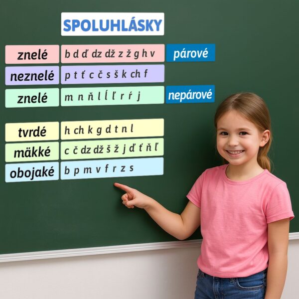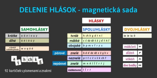 Delenie hlások je magnetická učebná pomôcka pre 1. stupeň ZŠ a MŠ, ktorá deťom uľahčuje pochopenie rozdelenia hlások na samohlásky a spoluhlásky. Vďaka prehľadným kartičkám a farebnému triedeniu pomáha učiteľom pri vysvetľovaní učiva slovenského jazyka a žiakom prináša praktický zážitok z triedenia a skladania.
